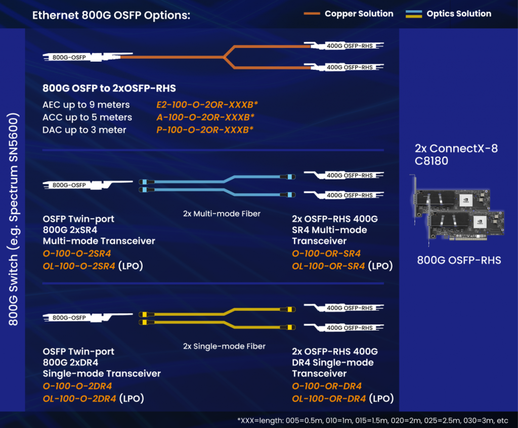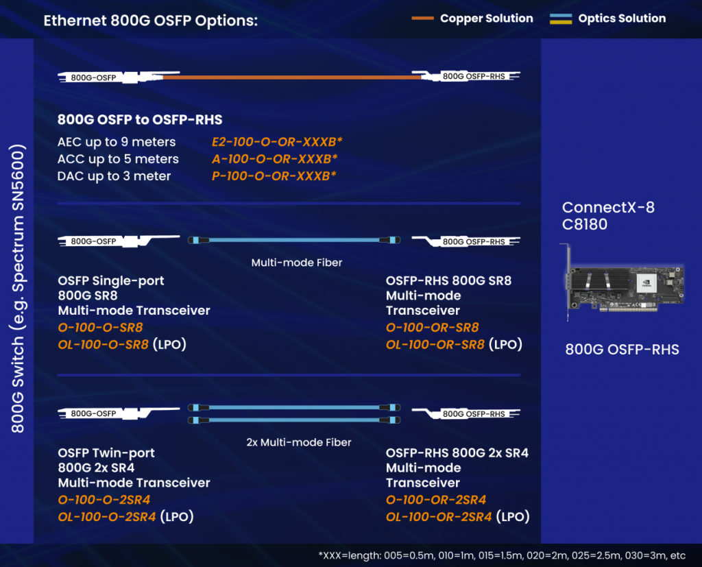Infraeo offers straight-through OSFP to OSFP-RHS DACs, AECs, and ACCs for short-reach connections. On the optics side, Infraeo offers single-port and twin-port SR transceivers. Coming in OSFP and OSFP-RHS form factors to fit the connectivity needs on both the switch side and NIC side. Low-power LPO transceivers are also available for power-sensitive deployments. For more details, see our product offerings at https://www.infraeo.com/products/