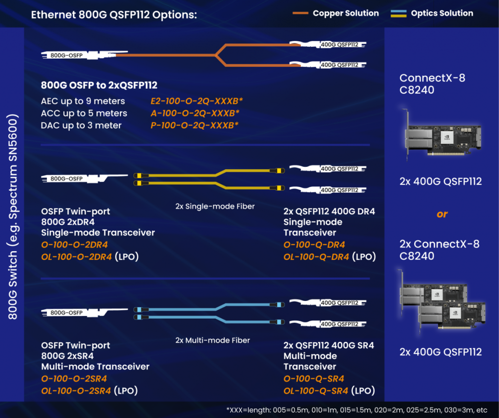Infraeo offers breakout OSFP to 2xOSFP-RHS DACs, AECs, and ACCs for short-reach connections. On the optics side, Infraeo offers single-port and twin-port SR and DR transceivers. Coming in OSFP and OSFP-RHS form factors to fit the connectivity needs on both the switch side and the NIC side. Our 800G OSFP-RHS transceivers can be throttled down to 400G by enabling only two ports. Low-power LPO transceivers are also available for power-sensitive deployments. For more details, see our product offerings at https://www.infraeo.com/products/